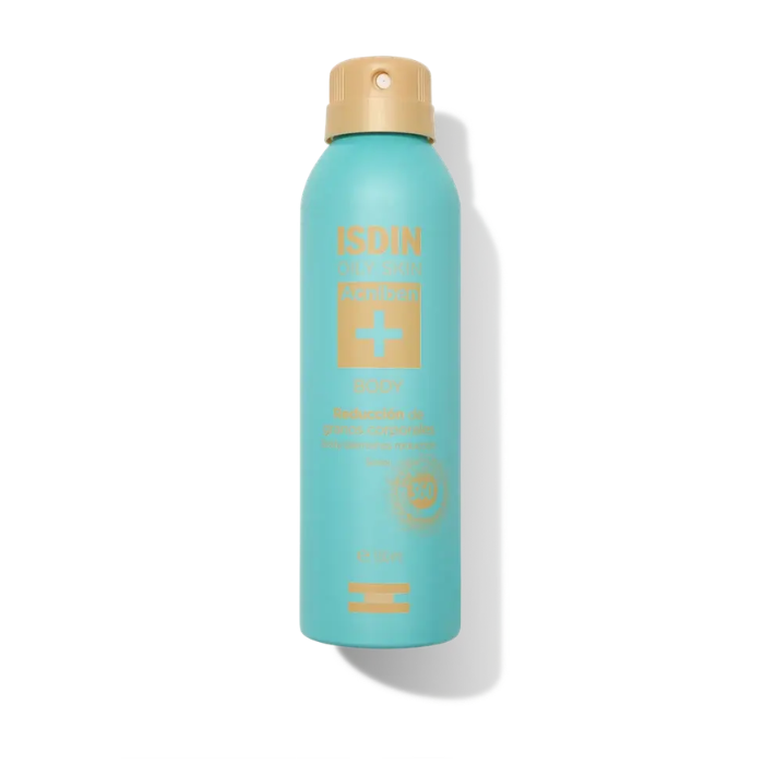 Teen Skin Acniben Body de Isdin es un spray corporal de secado rápido que permite reducir los granos corporales. Está indicado para pieles grasas con tendencia acneica en el tercio superior del tórax, espalda y pecho. Utilizar diariamente el spray Acniben Body a unos 5-10 cm sobre la piel; para facilitar su absorción, aplicar un suave masaje sobre la zona. Acniben Body evita la creación de imperfecciones gracias a su contenido en ácido salicílico, además de ser antiirritante y antimicrobiano. A su vez, penetra en los poros, controlando el exceso de grasa y, gracias a la exfoliación, permite renovar las células de la superficie de la piel.