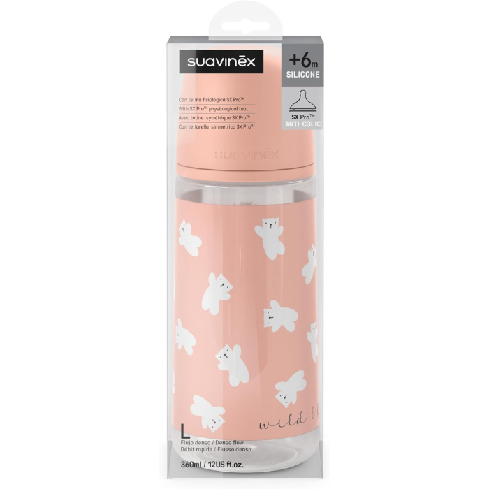 El Biberón Tetina Silicona Fisiológica Suavinex Flujo L de 360 ml presenta la Tetina Fisiológica SX Pro™, The Teat Revolution! Este biberón ha sido diseñado para ofrecer una alimentación más natural, respetando el desarrollo de la cavidad oral del bebé: