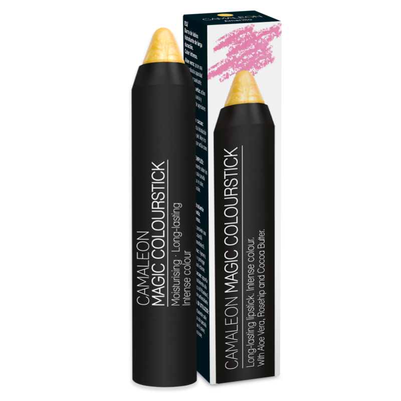 El Camaleón Magic Colourstick es un pintalabios permanente con 12 horas de duración demostrada. Su fórmula es hidratante, de color intenso y resistente al agua. Este labial nutre, regenera y protege los labios, al tiempo que realza la tonalidad natural sin cuartearse. Gracias a sus activos naturales, consigue hidratar, nutrir, remineralizar, suavizar y regenerar los labios, dejándolos cuidados y sensuales. Su composición permite que el color sea totalmente personalizado, ya que los pigmentos especiales reaccionan a la humedad de la piel y el aire, desarrollando un color único con más de 12 horas de duración. Hay seis colores para elegir: gris, amarillo, verde, rojo, coral y melocotón.
