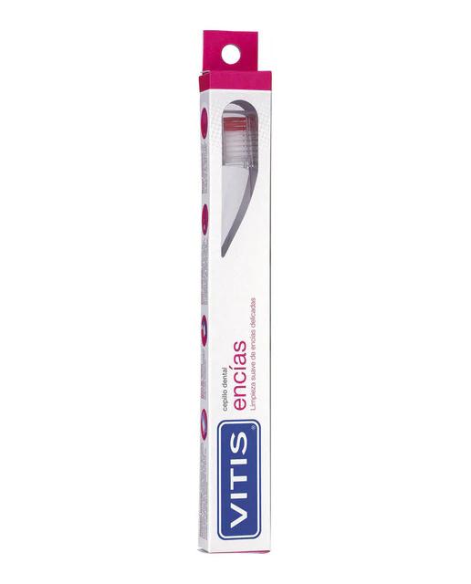 El Cepillo dental Encías Vitis está diseñado para combatir la sensibilidad dental provocada por las recesiones gingivales. Es un cepillo de uso diario con un cabezal pequeño y filamentos suaves de perfil recto. Su cuello maleable permite la flexión hasta adquirir la posición que mejor se adapta a la cavidad bucal, facilitando así el acceso durante el cepillado. Además, cuenta con un mango anatómico y con estrías antideslizantes para mejorar su uso. Incluye un capuchón protector que mantiene los filamentos agrupados y en condiciones óptimas de higiene. Disponible en 6 colores: transparente, verde, azul, rojo, amarillo y lila.