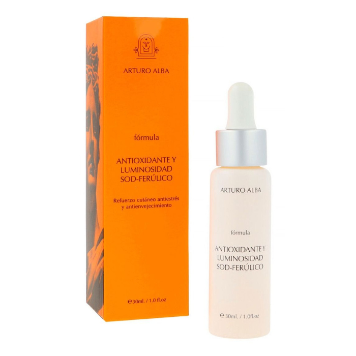 La FÓRMULA ANTIOXIDANTE Y LUMINOSIDAD SOD-FERÚLICO 30ML ARTURO ALBA es un tratamiento especializado diseñado para combatir los signos visibles del envejecimiento cutáneo, proporcionando luminosidad y protección antioxidante a la piel. Su formulación está enriquecida con ferulato de sodio, un potente antioxidante que ayuda a neutralizar los radicales libres, favoreciendo la regeneración celular y mejorando la textura de la piel.