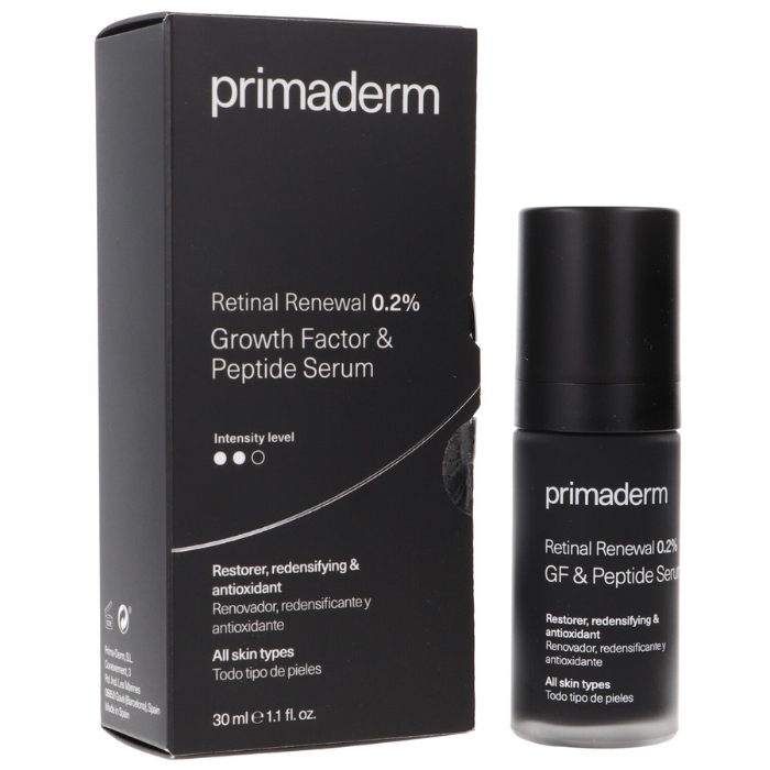 PRIMADERM RETINAL RENEWAL 0.2% es un innovador tratamiento cutáneo que combina un factor de crecimiento y péptidos para potenciar la renovación celular y mejorar la apariencia de la piel. Este producto está especialmente formulado para abordar signos de envejecimiento, incluyendo arrugas, líneas finas y pérdida de elasticidad.