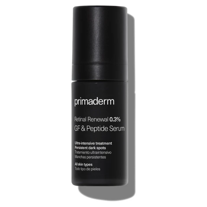 PRIMADERM RETINAL RENEWAL 0.3% GROWTH FACTOR PEPTIDE SERUM es un suero avanzado formulado para mejorar visiblemente la apariencia de la piel. Su innovadora composición incluye un 0.3% de retinol, conocido por su capacidad para estimular la renovación celular y reducir los signos del envejecimiento, así como un péptido de factor de crecimiento que promueve la elasticidad y firmeza de la piel.