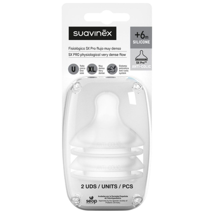 La tetina de silicona fisiológica de flujo denso Suavinex SX es un producto especialmente diseñado para bebés mayores de 6 meses. Su forma anatómica y su tecnología de flujo denso permiten una succión natural y cómoda, favoreciendo el desarrollo correcto de la boca y los dientes.